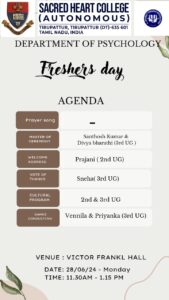 The Programme was held on 28″ June 2024, Friday in Viktor Frankl Hall. The programme kicked off around 11.30 a.m. The programme was begin with the prayer song by Ms. Kanmani and Mr. Joe. Then welcome speech was delivered by Ms. Prajani from Second year. Then Sr. Anthoniammal, Assistant professor of our department gave us a motivational story. Soon after this, the cultural programs was started. Firstly a dance performance was done by Second and Third year girls. After the dance performance, Singing was done by Second and Third year girls. Then again a dance Performance was done by Third year boys. Then Party game was conducted for the First year student by Third year Girls. First year student were really very cooperative throughout the programme. Few of the students from First year have exhibited their talents in the programme. At last, the programme came to an end with Vote of Thanks, by Ms. Sneha from Third year. The Masters of Ceremony were Mr. Santhoshkumar and Ms. Divya Bharathi from Third year. The programme was a grand success under the guidance Mrs. Kothaivani, Association president and under the incharge of Mr. Santhoshkumar, Mr. Rubanraj and Ms. Vennila. At last, Snacks has been provided to the student. The programme came to an end around 1 p.m.