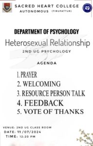 We had the psychosexual integration session given by respected father Sanjay. It started by 8.30 am and concluded by 10.20 am. We were of 51 students. It’s really useful for us and very helpful for us to understand what is exclusive relationship and inclusive relationship at what age we get love and attraction on opposite gender with the realistic examples. The 14 years boy he can’t able to see a girl normally someone kind of attraction he had. He read a bible he comes to know that it was a sin and he was in thinking that I’m I doing sin. We discuss about it with our classmates what suggestion that we can give to him. We came to know that through this session that it all was natural at this age. Attraction will definitely comes at this age but we should be aware of those things. If it’s not comes only we may have some problem but it’s totally normal. Nowadays children at the age 10, 9 and at the of 8 they are saying that they are in love the 6 the standard girl searching about sex in Google, who told them at this small age. It’s not a fun thing we should know how they are influenced. The media plays a vital role to influence the children. Watching movies videos on Integra makes a bad impact on the children. They don’t know the difference between love and attraction. They unconsciously believe things shown in the social media. Many children are affected. Attraction comes at all ages there’s no end for that. Even a 70 years old men or women get attraction. In our life span we get attraction in 83 lakh people but that’s not love. Crush is also not love. Crush means you just like a person. It not last for long time. The love map means the expectations of our partner that we have created by ourselves. We search for a people who set for your character it basically some similarities. We get attraction of people who take care like our father or mother or brother. We have the curiosity to know about the opposite gender. There are 3 stages in love. The first one is romantic stage. It’s not love. The second stage is hatred stage. In this stage the people who are in relationship comes to know the positive and negative side of the person. But in the first stage we only know the person’s positive side so we may attraction on that person but when we know the both side many break ups are all happen. This is also not a love. The last stage is call attachment. In this stage can be defined as the real love we accept the person who they are actually. Accept their flaws and all. People may have wounds in childhood healing their wounds each other in this teen age it’s just an infatuation. We think that it was love. Amygdala is responsible for our emotions. We may not aware of the realistic things. Possessive Love is not a love. We try to hold that person. But it’s not correct. We only love a person when we stand by our own self. Finally we aware of love and attraction.